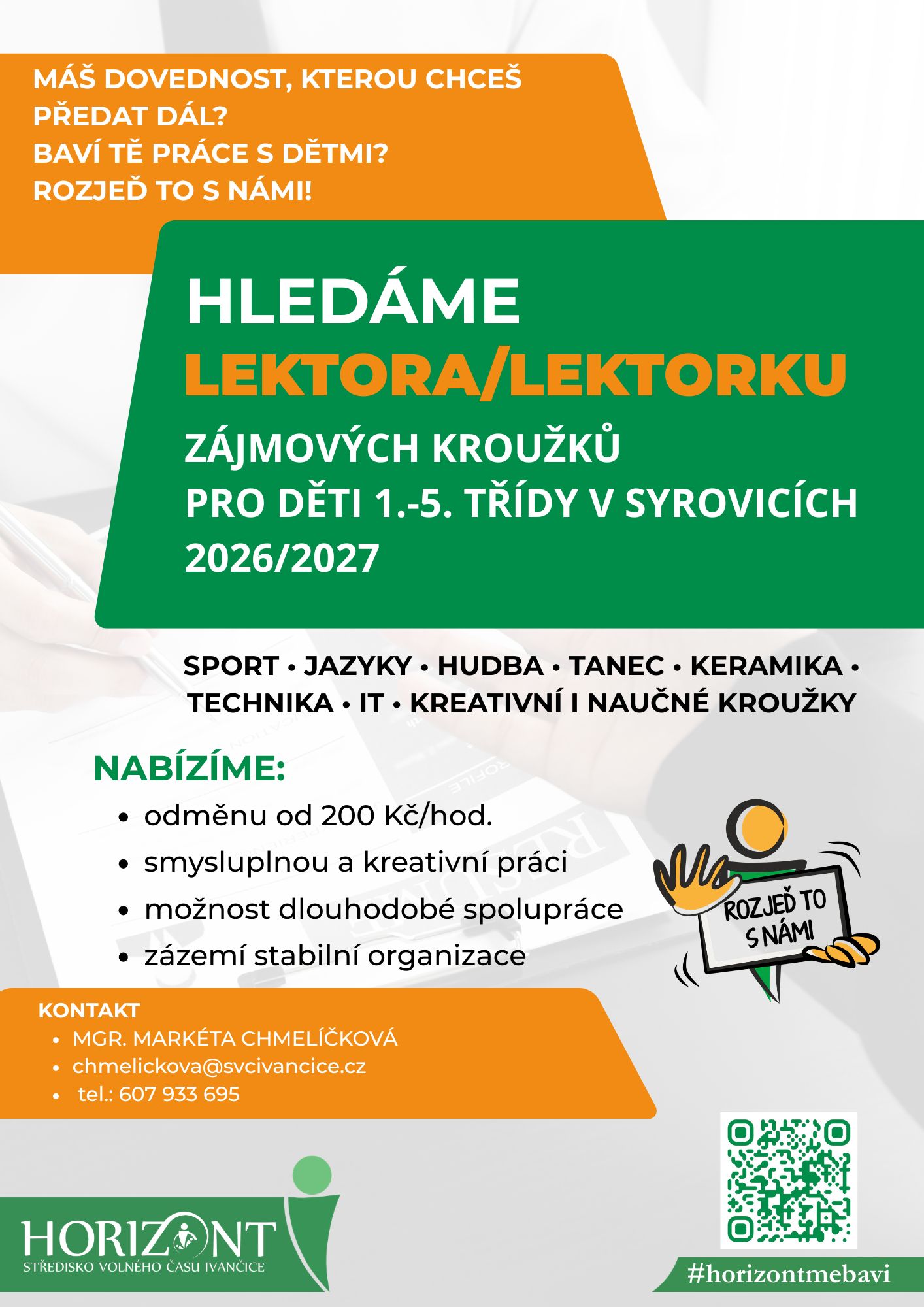 Pokud cítíte, že byste mohli dětem předat kousek svého umu, nebo víte o někom šikovném ve svém okolí, neváhejte se ozvat.
